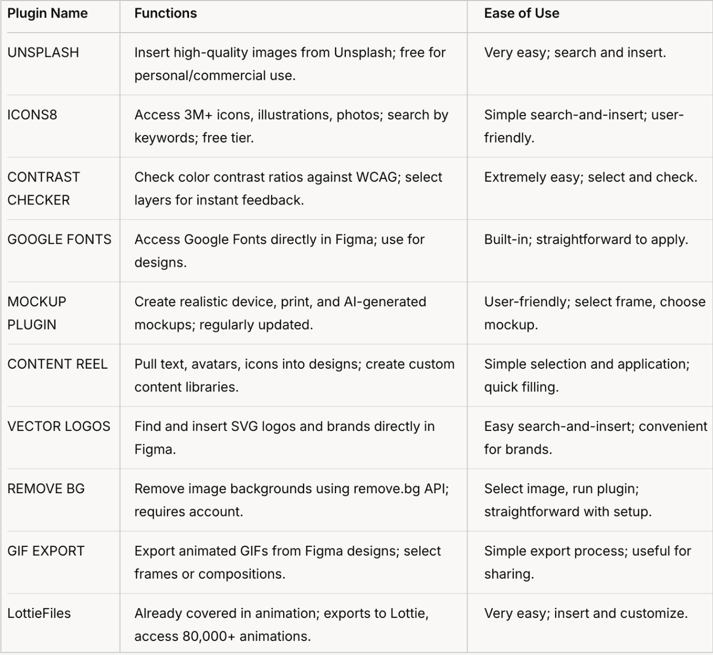 Figma plugins enhance design workflows by automating tasks and integrating advanced features. Below, I’ve organized the plugins into categories for clarity, detailing their functions and ease of use.
