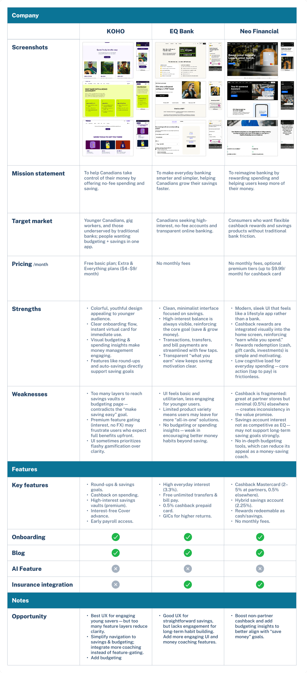 Insights from market research by comparing KOHO and two finance technology platforms also shows the lack of easy budgeting tool available to users. As well as the lack of AI adoption in their user experience. Where these two aspects can highly resonate to each of their own mission statement and bring it closer to their product's goals. Thus, this create opportunity for my vision for this project.