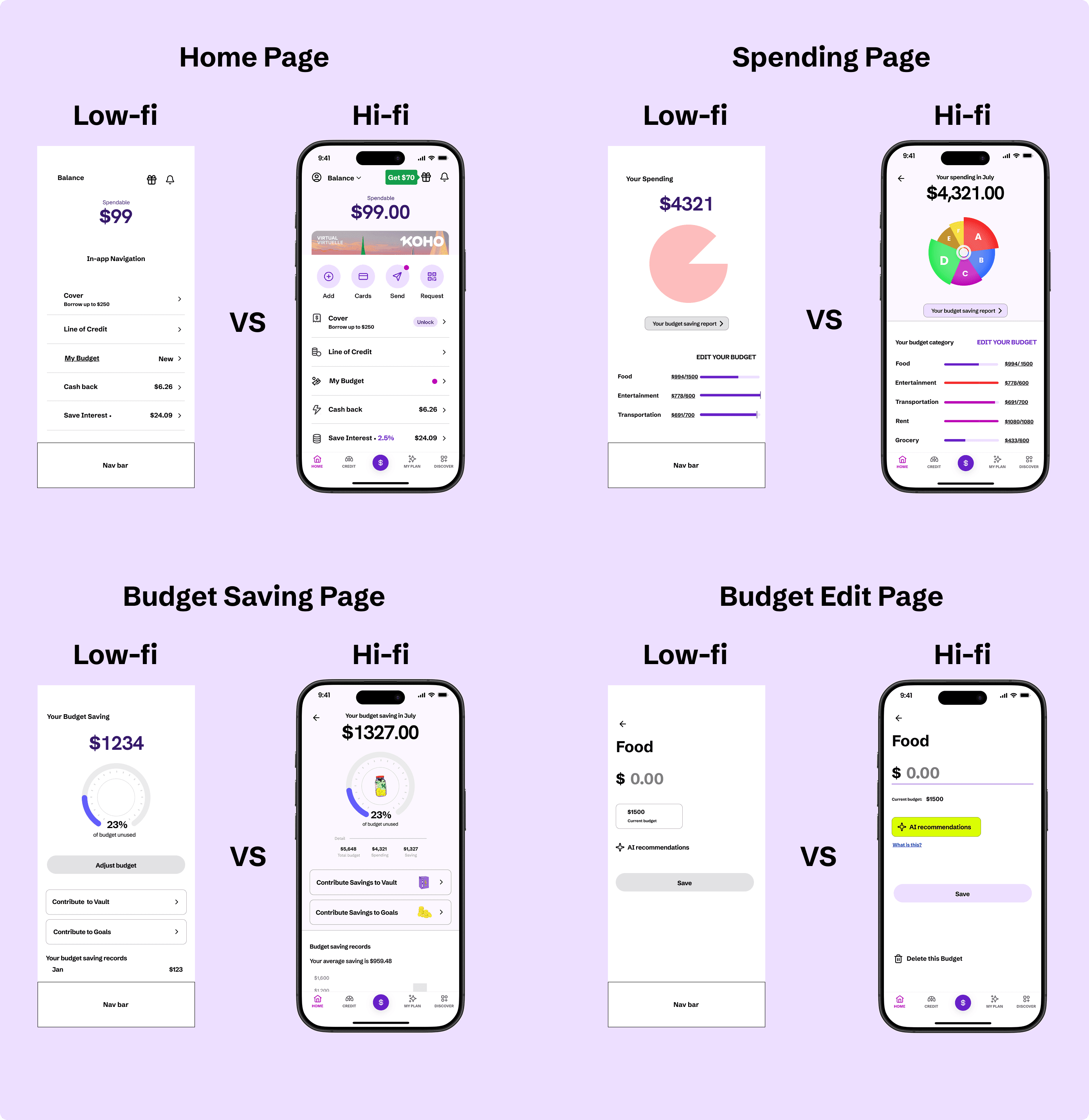 I focused on aligning visuals, motion, and tone with KOHO’s youthful, energetic brand, using color, animation, and playful micro-interactions to appeal to young, budget-conscious users 👩🏻🧑🏼.