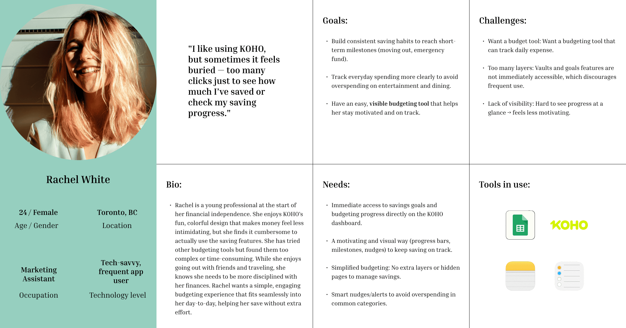 A functional persona here addresses my user's goals, the challenges that she faces, and her needs for savings. These areas set as the foundation to guide my design direction, and that I can always come back to for reference.