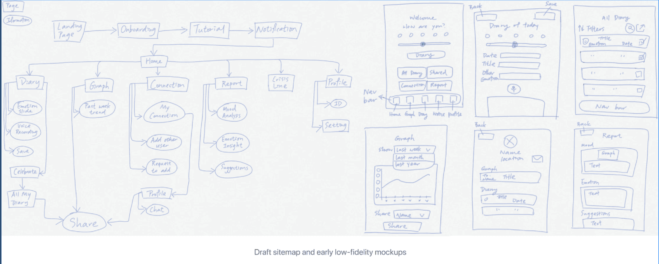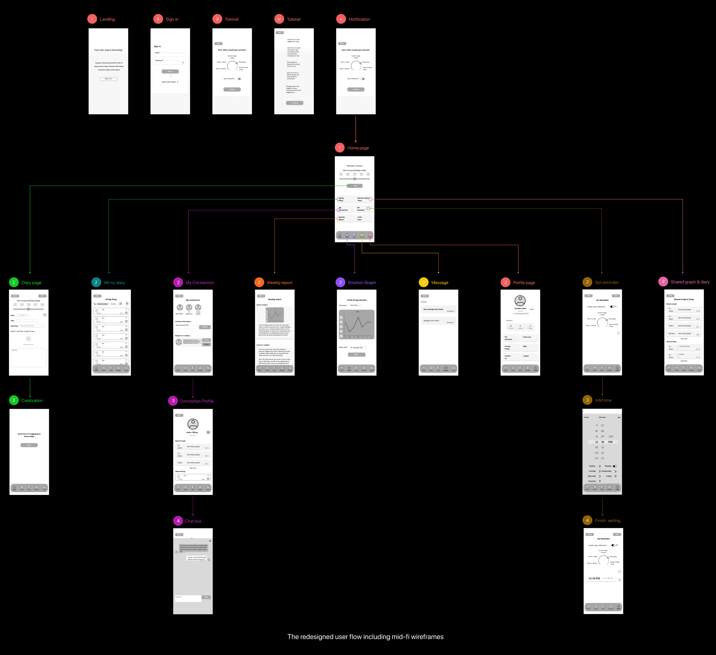 Moodie’s initial design idea shows all features can be navigated from the home page: diary, graph, connection, report, help resources, and profile. Which I learned later that it is a great way for user navigation. After conducting user-testing with 5 people, it was suggested that in order to bridge user and their therapist together through this design, and to encourage usage consistency, there are other features that would be nice to include: notification to show any update from other users, faster access to the chat feature, faster route to set a reminder, also quick access to keep track of all the shared graph and diary between users. I redesigned the user flow map with this change in mind to make sure various features’ routes were faster to access.