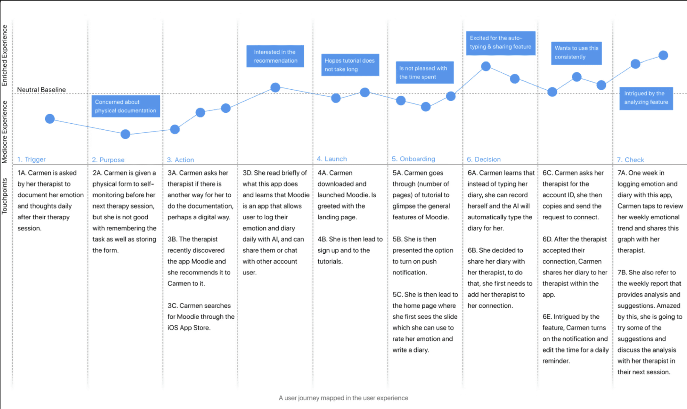 From the data I collected, I created an ideal user flow as how I imagined my app to pan out and what my desired user experience would entail. It later developed into an experience map, which captured Carmen’s (the user persona) journey and emotional results with each touchpoint she performs within the app.